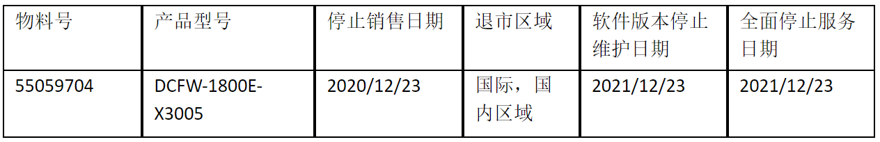 北京神州数码mile米乐集团信息技术有限公司正式通知您, 以上DCFW-1800E-X3005下一代防火墙(55059704)将于20201223号停止接收新的订单(具体日期见上表),不再供货。给您带来的不便,敬请原谅。